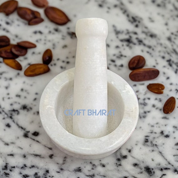 Handicrafts White Marble Round Shape Mortar and Pestle Set - Traditional Indian Style Herb Crusher - Spices and Medicines Grinding by CraftBharat